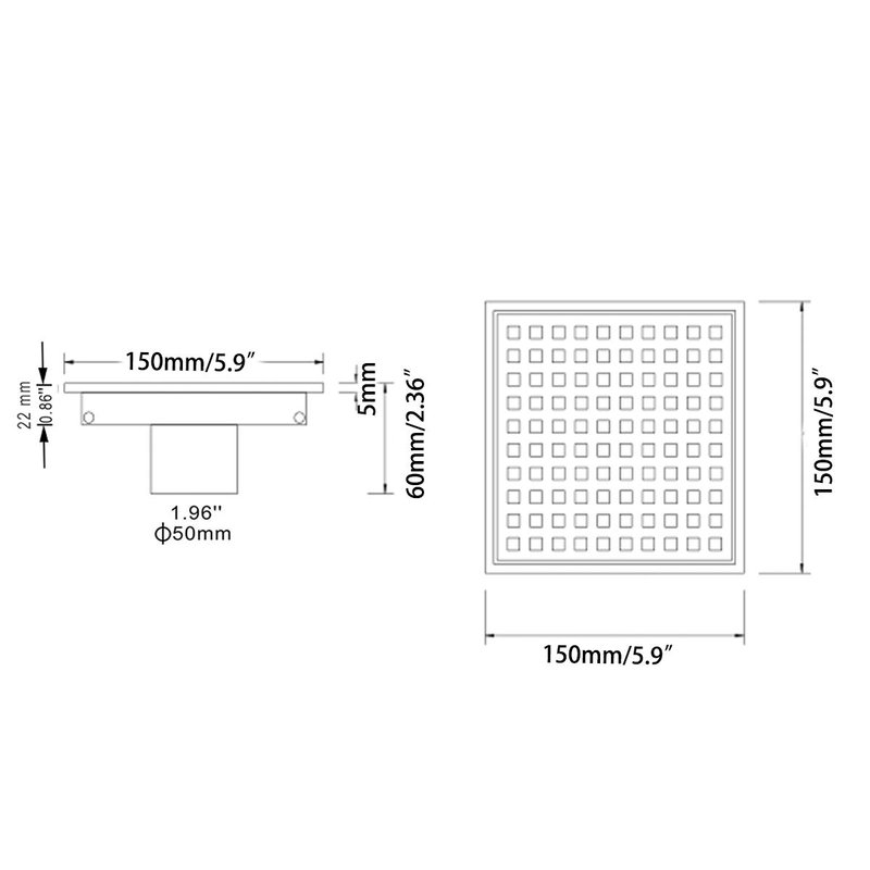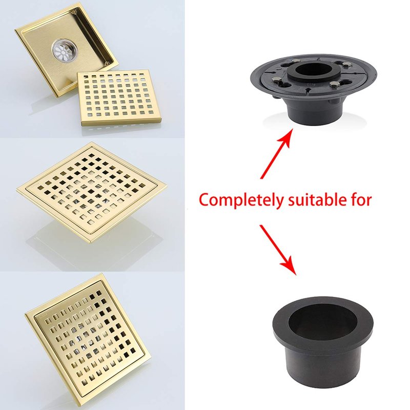 - Square Design,5.9 inch Width,2 inch High Flow Outlet(NOT SCREW INTO DRAIN RISER TYPE). Fits US NO HUB Drain Base System, 2" PVC No-hub Shower Drain Base can be Purchased Separately