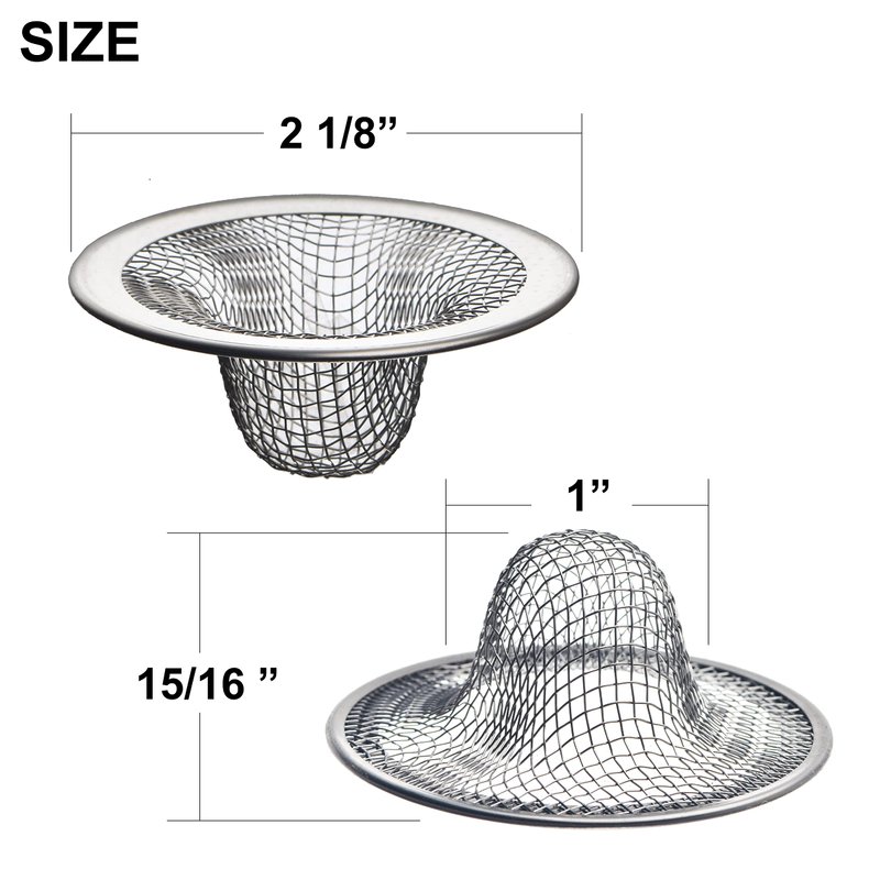 6 Pack Mesh Sink Drain Strainer for Bathroom, Utility, Slop, Laundry, RV and Lavatory Sink. Our strainers made of quality rust-resistant, durable and reliable material. Perfect for sinks for daily usage for long lasting protection against drainage clogging. 2.125” Top diameter and 1" Basket diameter. Comes with rim to fit over sink's drain. Basket Style design. Efficient anti-clogging strainer lets liquid flow into the drain while it blocks particles. Allows to be cleaned easily without hassles.