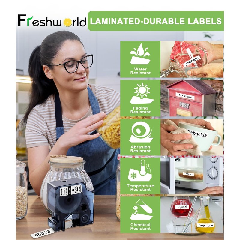 - Long Lasting & Durable: NON-OEM.Laminated Tape -which makes Replace 45013 dymo tape durable even in harsh conditions.Strong adhesion, Water-resistant, Fading-resistant, Abrasion-resistant,Chemical-resistant,Higher or lower temperature-resistant as well as Grease-resistant,Exposure to sunlight without fading or peeling.
