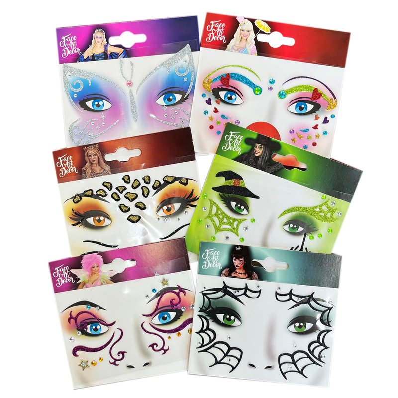 Let your kids shine and transform into their favorite characters with these Glitter Animal Face Stickers! This 6-pack of gold glitter face tattoos features vibrant, animal-themed designs like butterflies, leopards, clowns, witches, and more, making them the perfect addition to any Halloween costume or cosplay event. Measuring 4.7 x 5 inches, these animal face stickers are sized perfectly for children, making them comfortable and fun to wear.