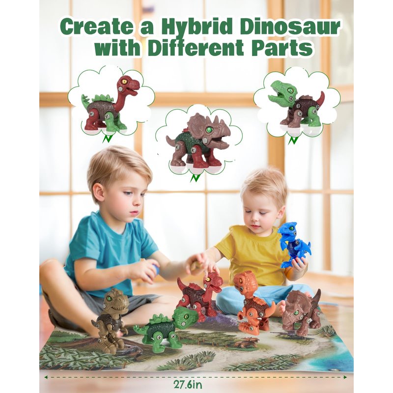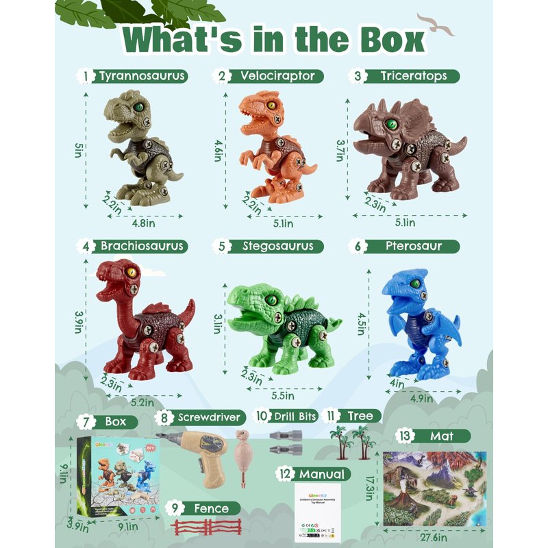 - 6 Pack Take Apart Dinosaur Toys: GleamKid dinosaur building kit includes a variety of dinosaurs: Tyrannosaurus, Velociraptor, Triceratops, Brachiosaurus, Stegosaurus, and Pterosaur; To enhance the building experience, it also comes with a manual screwdriver, an electrical screwdriver, drill bits, a map, a fence, a tree, a mat(Mat size 27.6" x 17.3"), and a comprehensive instruction manual; Perfect for aspiring paleontologists and dino lovers!
