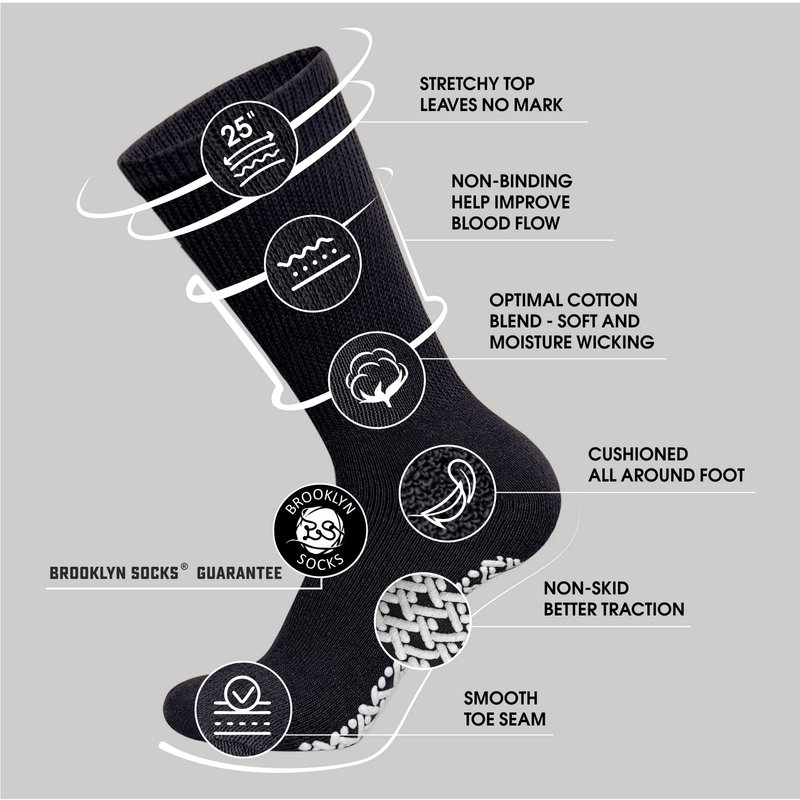 Feel the cushioned comfort in everyday step with excellent mens and womens diabetic socks with gripper bottom from Brooklyn Socks. Slip resistant tread grips provides greater traction on smooth surfaces such as hardwood, vinyl or tile floors. Our non-binding socks feature a loose knit design that provides proper cushioning without squeezing or constricting your legs. These must have diabetic socks are physician approved and highly recommended for people with diabetes, edema, and neuropathy caused by circulatory problems.