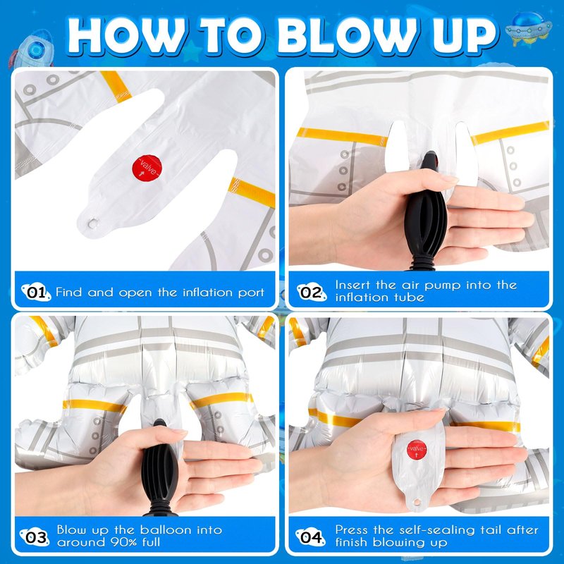 - Easy To Use: Our astronaut foil balloons are easy to inflate and deflate. You can use a balloon pump or blow them up manually. The balloons are self-sealing, so you don't need to worry about air leakage. They are also easy to assemble and disassemble, saving you time and effort.