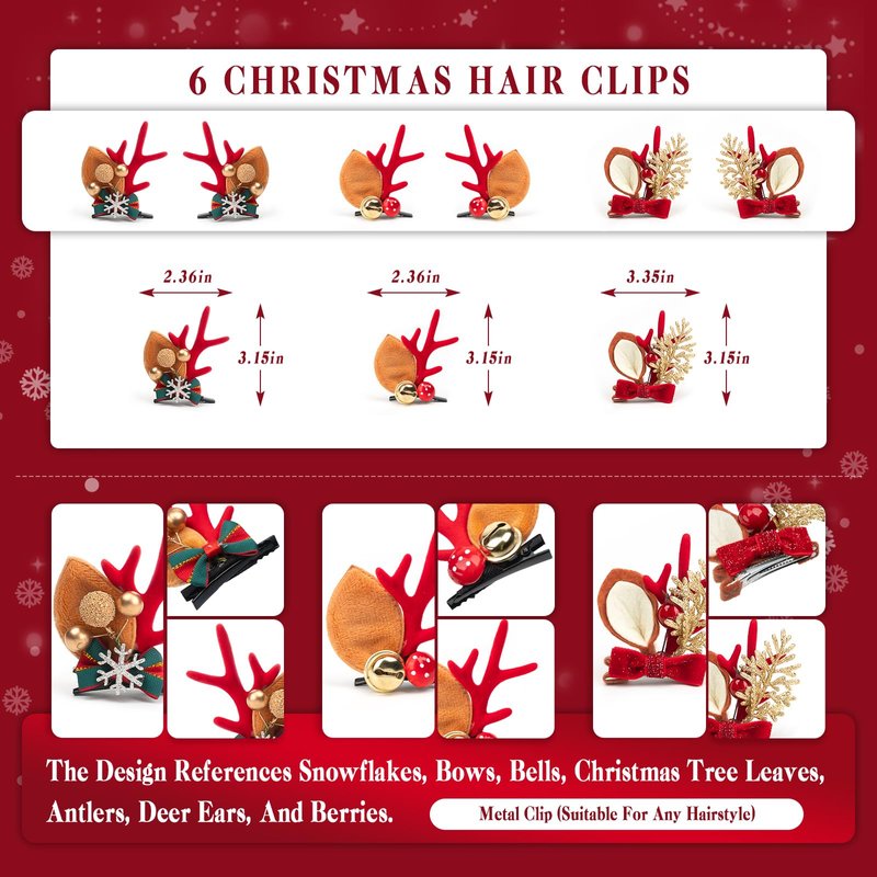 - 【Package includes】 6 pieces (3 pairs) of Christmas hair clips for girls, our hair accessories are nice for adding some fun to most Christmas costume or get together; Not only do these hair clips hold hair firmly in place, but save your time to take care of your little girl's hair style