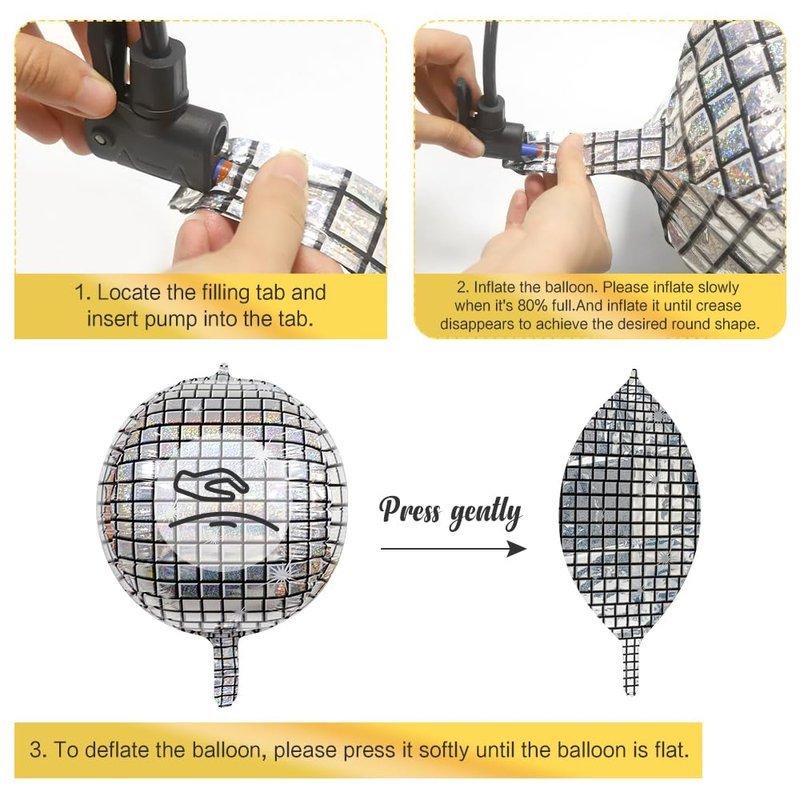 - 💌MATERIAL AND SERVICE: Disco balloons are made of high quality mylar foil material, strong and unbreakable, safe and environmentally friendly. However, please do not overfill the disco ball balloon and avoid sunlight, excessive heat, sharp objects and excessive friction. Strong winds or excessive flapping may cause the balloon to break. If you have any questions, please contact us and we will do our best to help you solve the problem so that you can have a good shopping experience.