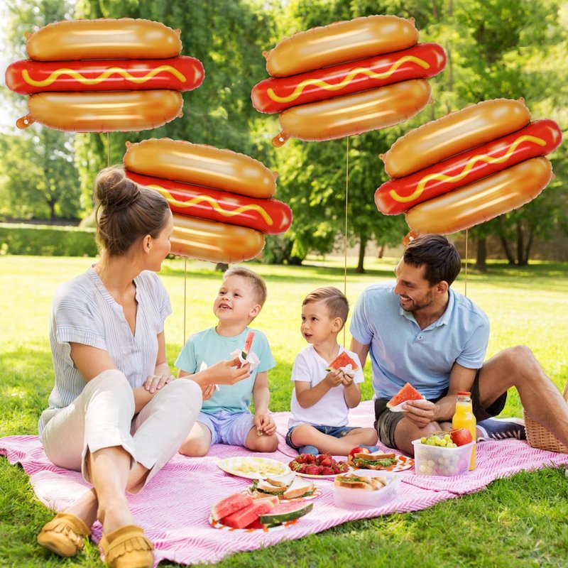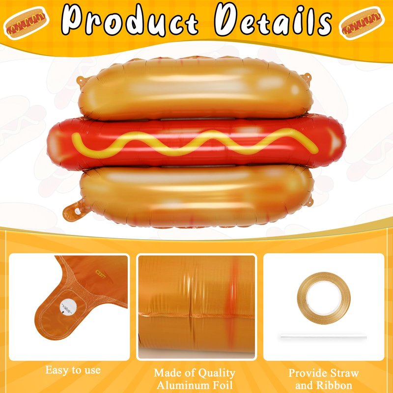 - Giant Hot Dog Balloons: You will receive 6 pcs hot dog foil balloons,a roll of gold ribbon and a straw.The balloons are 28 inches in diameter when fully inflated, which are enough for you to decorate your picnic party.