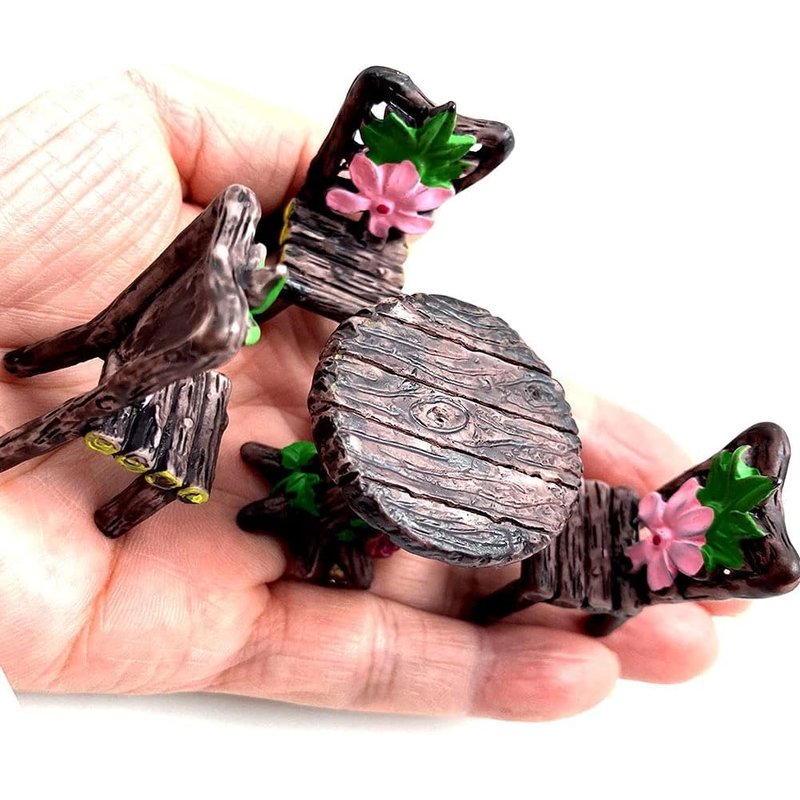 Bring a touch of whimsy and charm to your miniature garden or dollhouse with this delightful 6-piece set of miniature furniture. Meticulously crafted with attention to detail, this set includes a charming table and five chairs, perfect for creating a cozy and inviting scene. The furniture pieces are designed to fit seamlessly into any fairy garden, terrarium, or dollhouse setting, allowing you to unleash your creativity and imagination. Whether you're an avid collector or simply appreciate the beauty of miniatures, this furniture set is sure to captivate and delight. Elevate your micro landscape or dollhouse display with this enchanting addition.