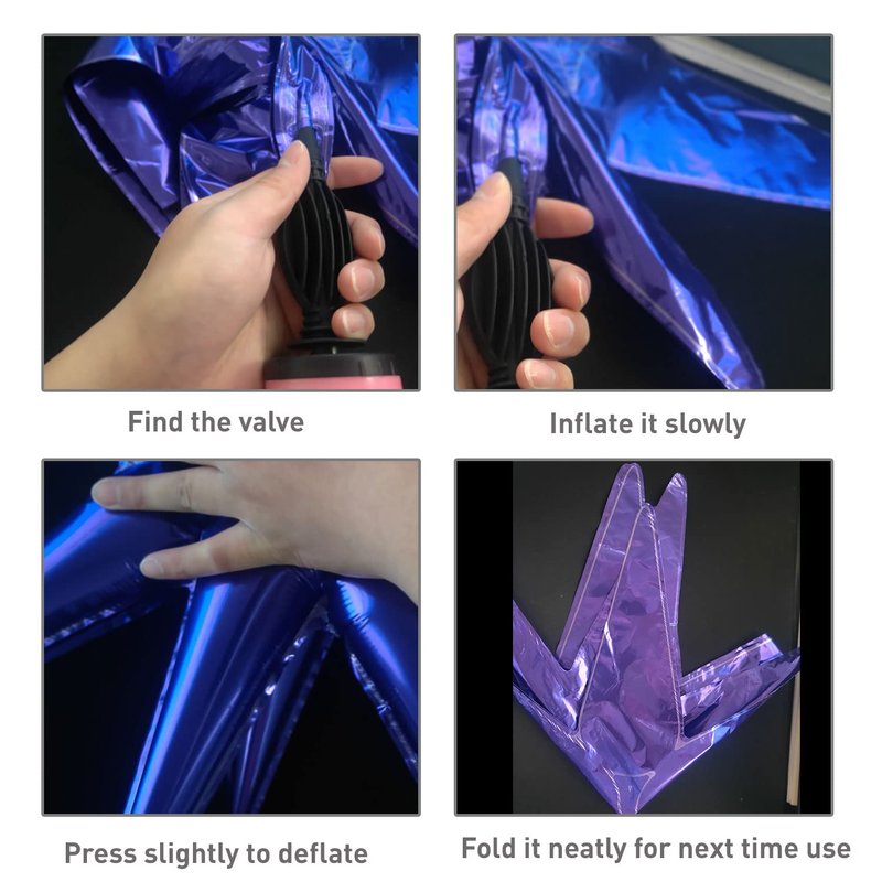 Use the inflator to pump the foil disco ball balloon to 80% by air or helium, when inflation being completed, pull out the inflator and pinch the inflation inlet flat. The air outlet will be automatically sealed by its matched self adhesive glue of the balloons inlets, and no additional knots are required (inflator is not included).