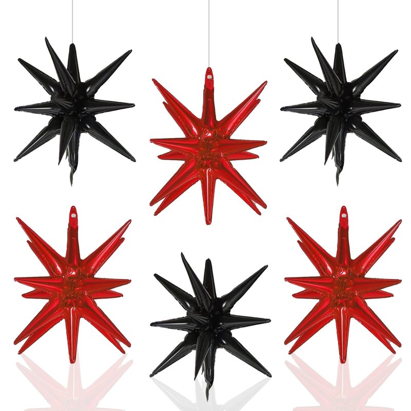 • 【Package Includes】You will receive 3 Black exploding balloons and 3 Red exploding balloons 22inch exploding star balloons. This star balloon doesn't need to be assembled, it is simpler to use, It is fully automatic sealing, and It can last for several weeks after being inflated, All the 6 pcs star balloons are one-piece explosion star balloons with 14 cones, so you do not have to assemble the cones on by yourself.