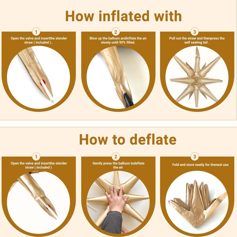 6 Pack 14 Point Foil Cone Balloons Starburst Cone Mylar Balloons Large Explosion Star Balloon for Wedding Birthday Party Photo Booth Decoration Supplies, Gold + Caramel Colour One-Piece 14-pointed Star Explosion Balloons 6 pcs PRODUCT SPECIFICATION: Material: Aluminum foil. PACKAGE CONTENTS: 6pcs silvery explosion star balloons SIZE: Each foil cone balloon measures approx 22 inches after inflation Easy to use: Use the inflator to pump the foil disco ball balloon to 80% by air or helium, when inflation being completed, pull out the inflator and pinch the inflation inlet flat. The air outlet will be automatically sealed by its matched self adhesive glue of the balloons inlets, and no additional knots are required (inflator is not included).