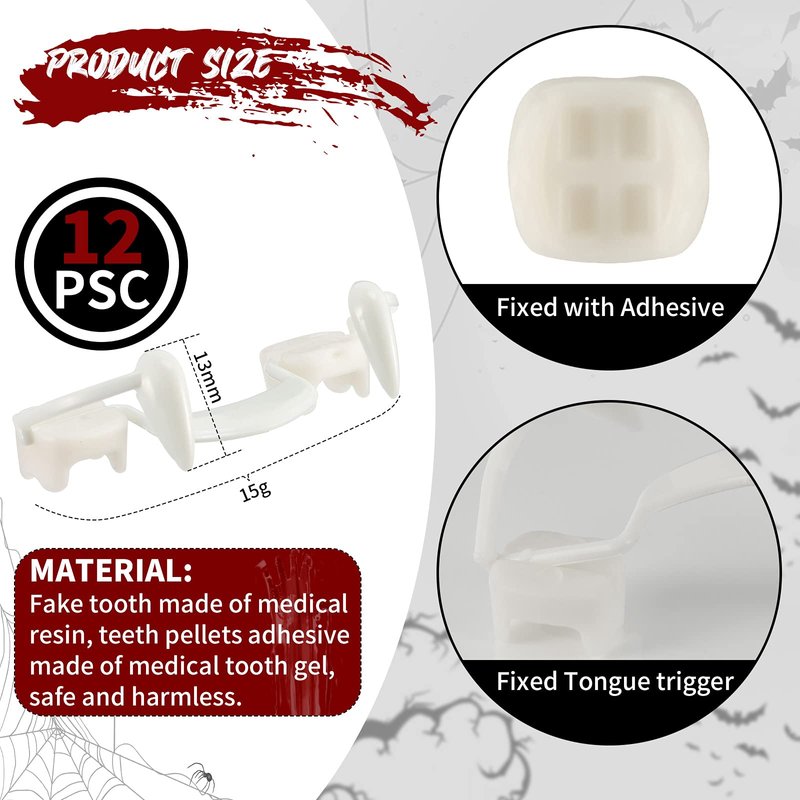 - The package includes: you will receive 6 pieces of retractable vampire fangs with teeth glue, and each is packed in a small transparent box, which are enough to satisfy your Halloween costume prop needs and replacement requirements, and bring you a wonderful and exciting party time