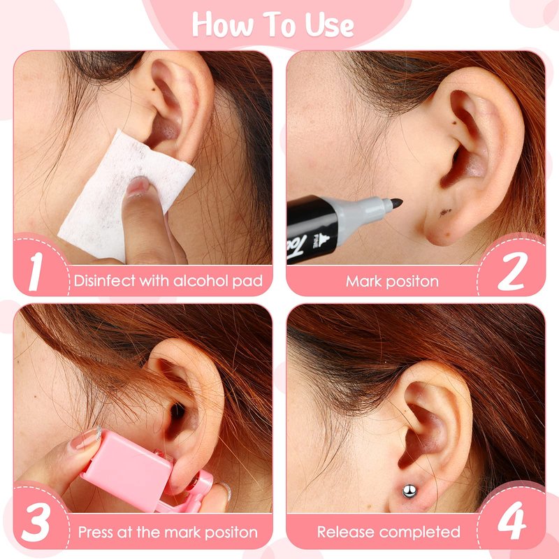 - Instruction: first clean your hands and wipe your ears, then mark the point on the earlobe you need to pierce with a pen, arrange in a straight line with the mark with an ear piercing tool, and then press it fast and firmly; The piercing process only takes a few minutes