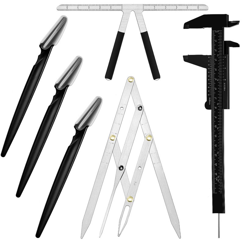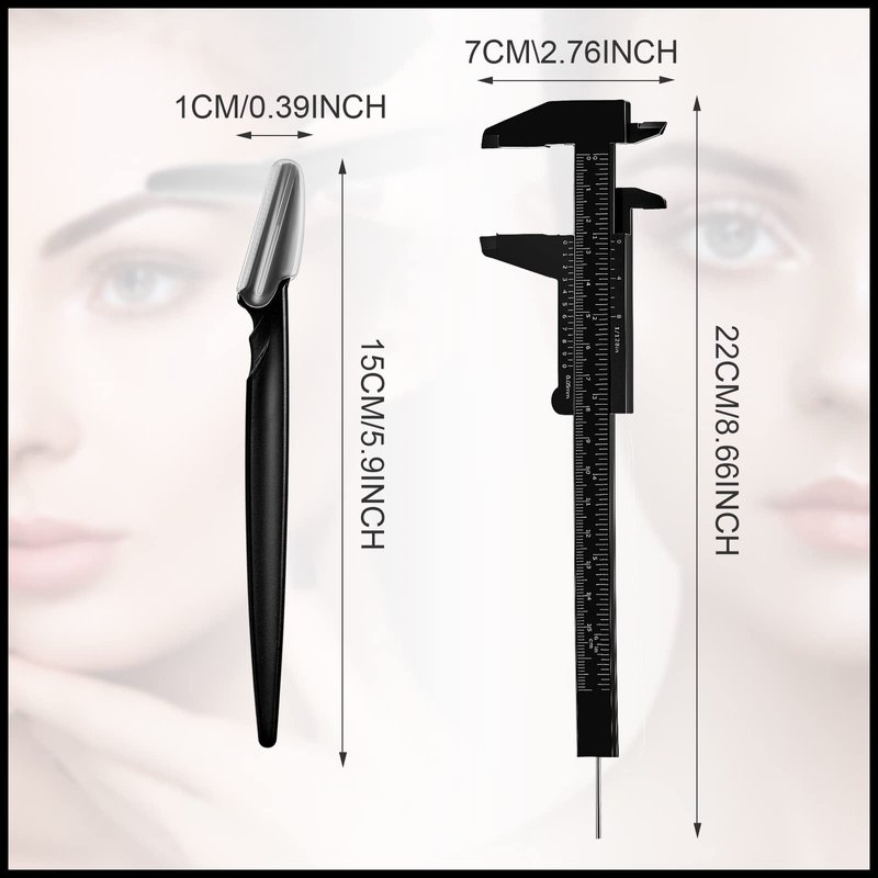 Features: Practical eyebrow shapers: Use these multi-functional beauty tools to have eyebrow trimming, facial hair removal, and removal of excess hair on the neck and elsewhere. Compact in size, suitable for you to carry most places. Convenient makeup experience: You can use the measure eyebrow ruler to learn how to draw eyebrows with your friends, which can improve your makeup skills and aesthetic ability, you can also get more interaction with your friends in the process of makeup. Specifications: Material: stainless steel, metal, plasticColor: black, silverSize: 3 Point positioning ruler: approx. 5.5 x 2.75 x 0.6 inchesGolden ratio caliper: approx. 7.87 x 2 x 0.4 inchesMini caliper: approx. 8.6 x 1.57 x 0.6 inchesEyebrow trimming knives: approx. 5.9 x 0.4 x 0.2 inchesQuantity: 6 piecesPackage includes: 3 x Eyebrow rulers3 x Eyebrow trimming knivesNotes: Manual measurement, please allow slight errors on size. The color may exist slight difference due to different screen displays. Pointed parts included, please keep away from children.