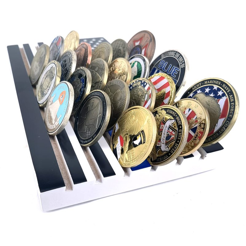- Our challenge coin rack HOLDS 36 -40 Challenge Coins - Custom Coins - Military Coins! Dimensions: 9.8“ x 5.1” x 0.8“,COINS NOT INCLUDE! This is NOT for coins in plastic holders.