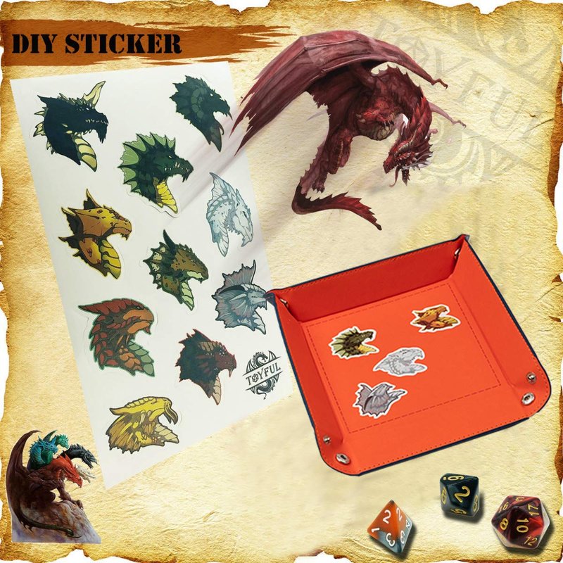 - DICE TRAY WITH DRAGON STICKER: 7 x 7 inches dice tray, easy to fold and unfold. The outside of the dice tray is made of thick PU leather and the inside is wrapped with softy PU leather. Rolling dice in style with dice tray kit. Perfect for dice games