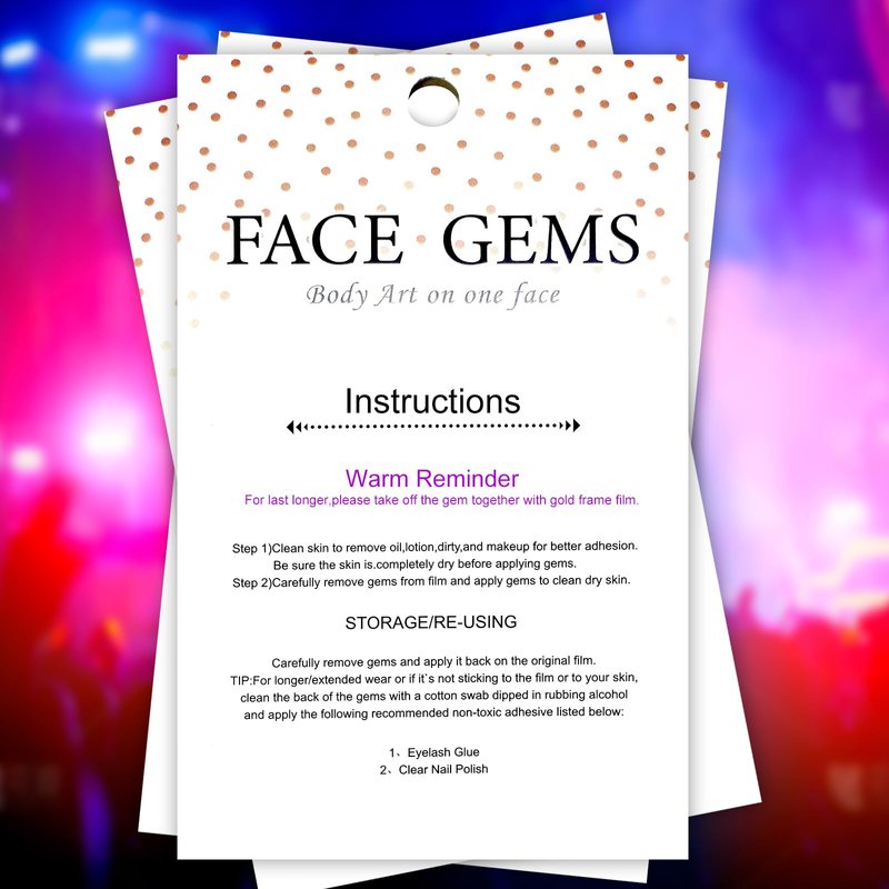 Re-using:Our face rhinestones gems support re-using.After used,carefully remove gems and clean the back with a cotton swap dipped in rubbing alcohol,then apply it back to the original film.