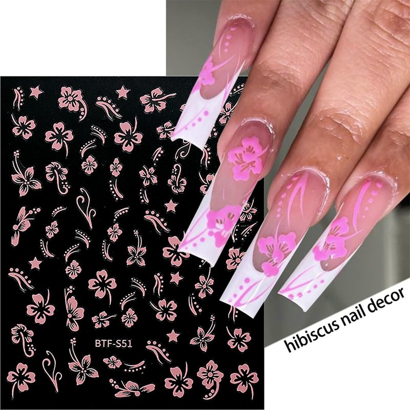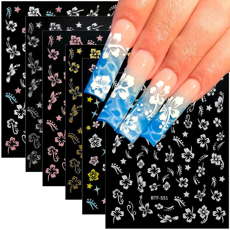 6 Sheets Flower Nail Stickers, 3D Self-Adhesive Hibiscus Nail Decals White Pink Gold Flowers Nail Art Stickers Summer Nail Design Decoration Nail Tips for Women and Girls DIY Acrylic Nails
