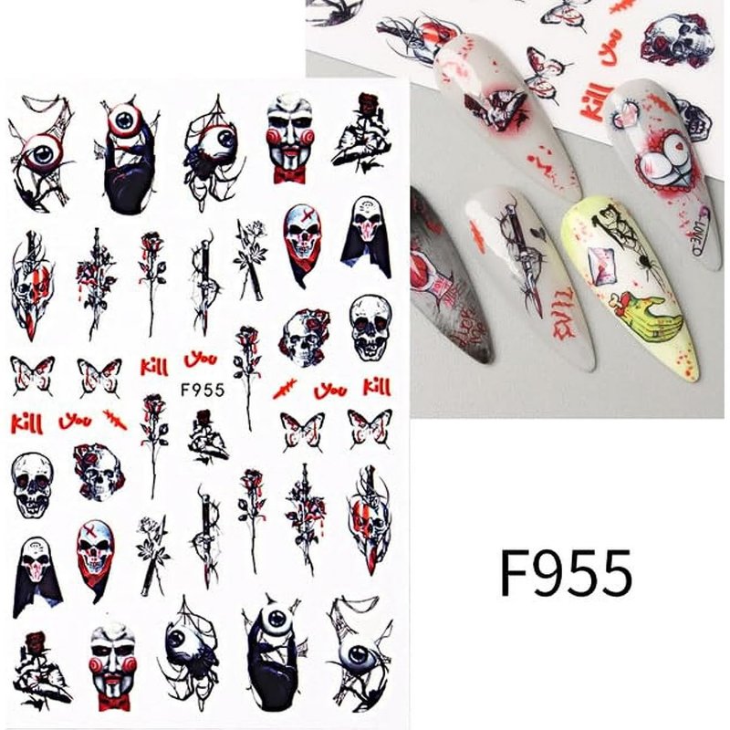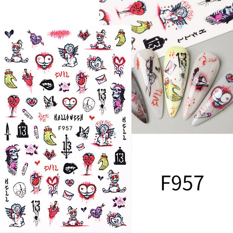 - Create Spooky Halloween Nails: Transform your nails into hauntingly beautiful works of art with our Halloween Nail Art Stickers. These 3D self-adhesive stickers feature scary scream, dark butterfly, bloodthirst rose, skeleton, zombie, and hearts designs, perfect for a chillingly stylish manicure.