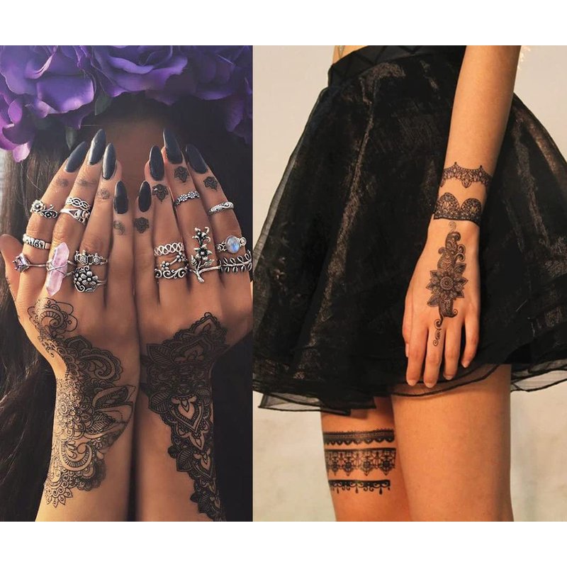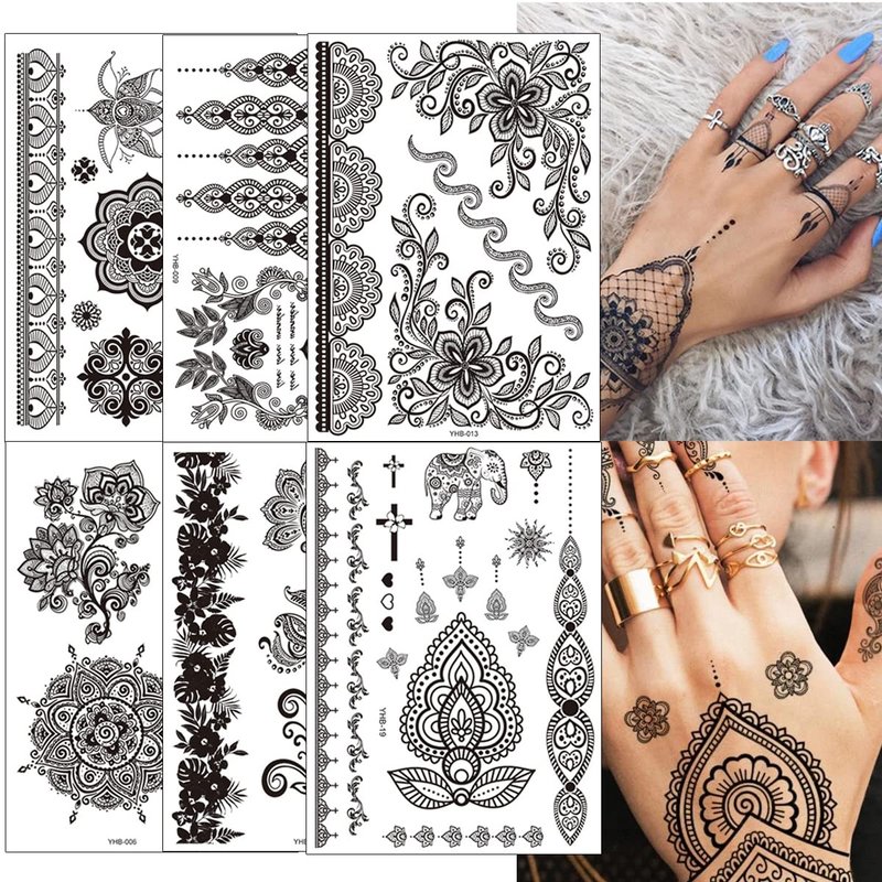 - [What is in] You will get 6 sheets black henna tattoo stickers. Each sheet has different styles and patterns, you can try to combine and match to find the tattoo you like!