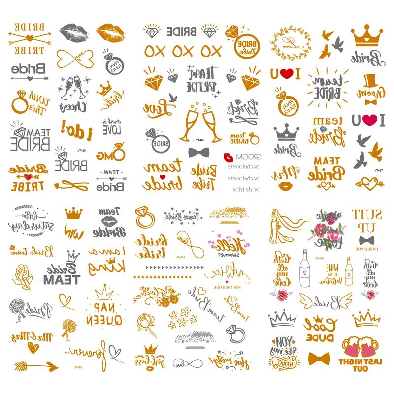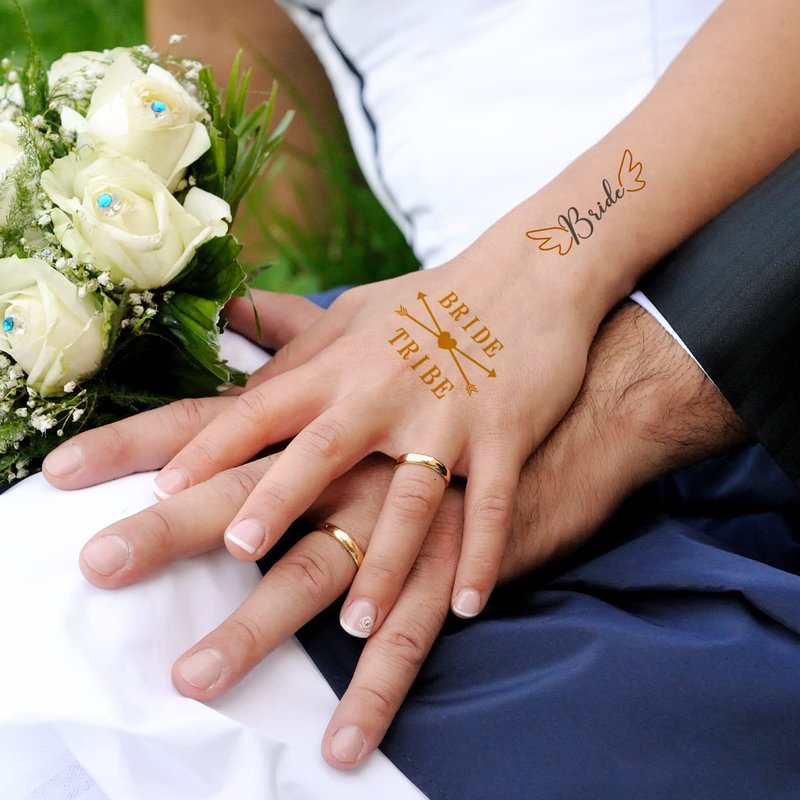 - FUN AND EYE-CATCHING::-- These gold temporary tattoos will make the bride and her tribe stand out. The shiny metallic finish ensures these tattoos catch the light and attention at any bachelorette party, bridal shower, or wedding celebration.