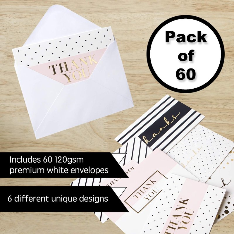 - ELEGANT & STYLISH - 60 Pack premium gold foil 4x6 thank you cards. Each card embossed with word ‘’Thank You’’ in Fancy Gold Foil Letters, with smooth matte finish creates an elegant and retro modern stylish look. Perfect for someone's special big day!
