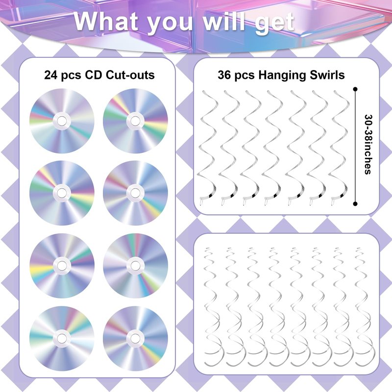 - Package Contents: our CD ceiling hanging contains 24 cards plus 36 spirals.Sufficient number of cards and spirals allows you to decorate your party at will without worrying about insufficient quantity.Unique decorations make your party impress your friends.