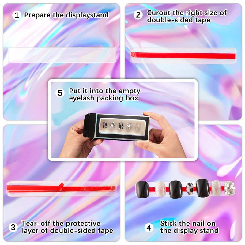 - Applicable Places: these paper empty eyelash boxes and clear press on nail stand can be widely applied for nail salon, Nail Design school, home use, office and more, which will be practical tools for both beginners and Nail Designists, and the red double sided tape can well fix your false nails, suitable for most smooth walls, doors, windows, carpets, glasses, mirrors and so on