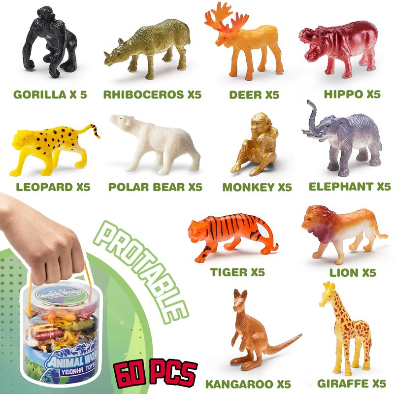 Mini animal toy set: 60 pieces include 12 varieties of animal figure, including gorilla, rhinoceros, deer, hippo, leopard, polar bear, money, elephant, tiger, lion, kangroo, and giraffe. What a lifelike mini animal figurine world!