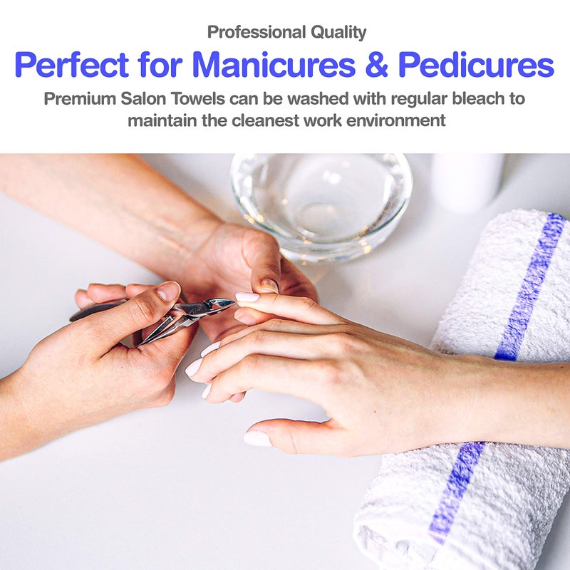 - Barbershop, Hair and Nail Salons: Durable cotton fabric can be washed with regular bleach to maintain the cleanest work environment. Perfect as warm relaxing spa towels for facials or to dry feet and hands as part of mani-pedi services.