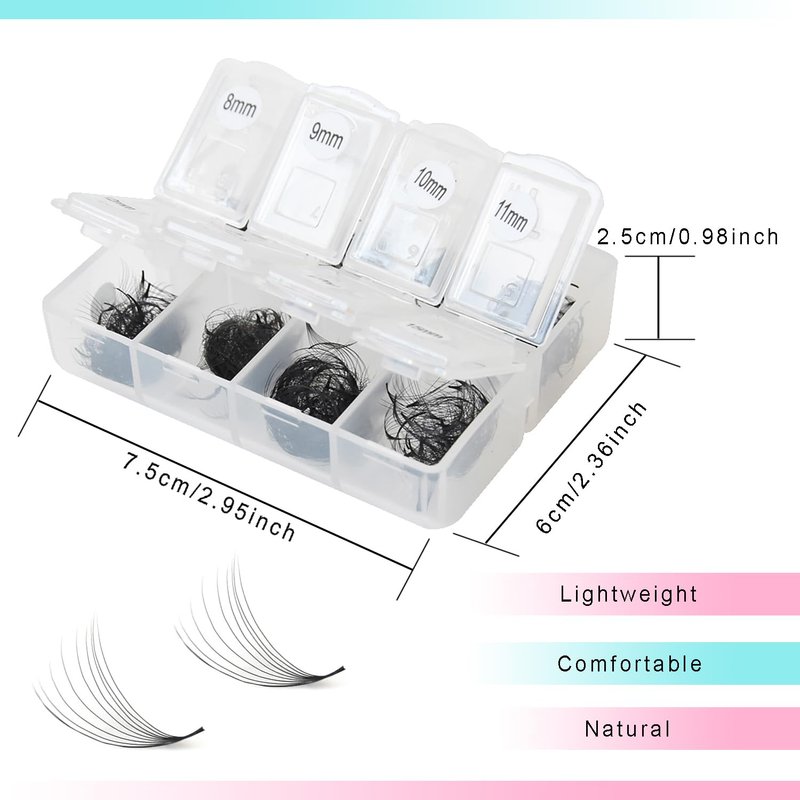 - 10D premade fans volume lash extensions our premade lash fans in box of 600 fans, each box has 8 separate grids (8mm/9mm/10mm/15mm 50 Fans per grid, 11mm/12mm/13mm/14mm 100 Fans per grid)