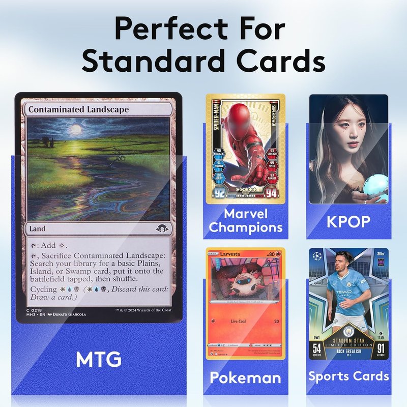 - WIDE APPLICATION—Measuring 66 X 91mm, perfectly sized to fit standard cards, such as Magic The Gathering Cards, MTG Cards, Pokemon Cards, Marvel Champions Cards, Kpop Cards, Baseball Cards, Football Cards, etc.