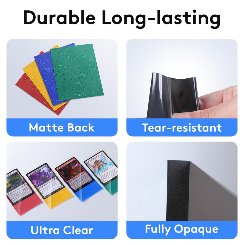- DOUBLE-SIDED DESIGN—The sides of the trading card sleeves are designed in different textures. The matte backing provides a better grip, and the front is clear and glossy. Crystal clear front and 100% opacity with textured back. Shuffle is smooth and durable, a good value for both playing game cards and collecting trading cards.
