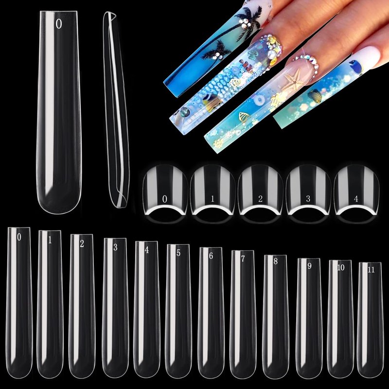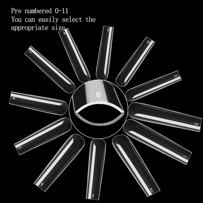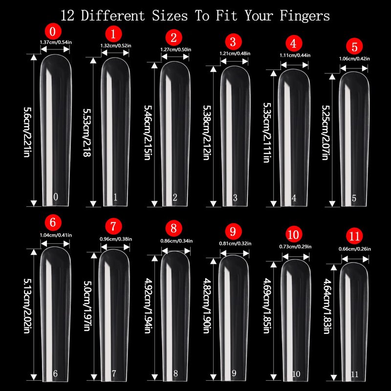- 12 SIZES XXXL ACRYLIC NAIL TIPS: 600 pcs tapered square nail tips has 12 different sizes to suit for most finger. Extra long press on nails has the pre-numbered, numbered 0-11 individually for you to distinguish easily and find your desired nails quickly. And 2 extra size can fit bigger or smaller nails, in case 10size can not suit few of your nails.