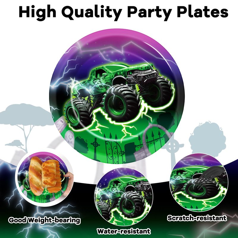 - Package includes: You'll get 60pcs monster truck party paper plates of 9 inches in 6 different designs. Brighten up your table setting with our green and purple monster truck paper plates that exude a playful and celebratory atmosphere, ideal for kid’s birthday party and baby shower.