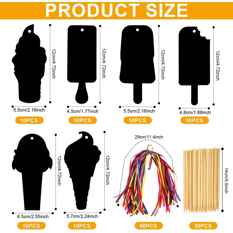 - Product Contents: You will receive 60 pieces of ice cream scratch cards (with 6 styles, 10 scratch cards each), 30 pieces of wood sticks and 60 pieces of ribbons.