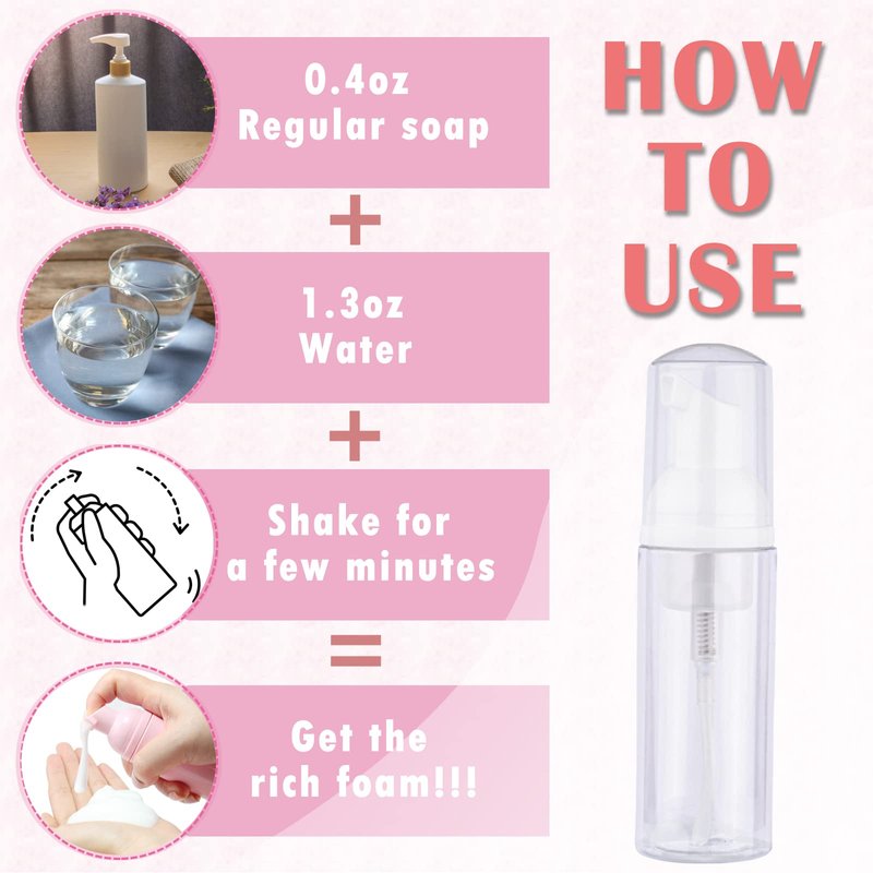 - Foam Bottles: Foam Pump Bottle Dispenser are made of high quality plastic, approximately 5.4 x 1.4 inches, 60ml/ 2oz. empty bottlle designs distinct, prevent leak and ensures liquid to be sprayed in a foam.