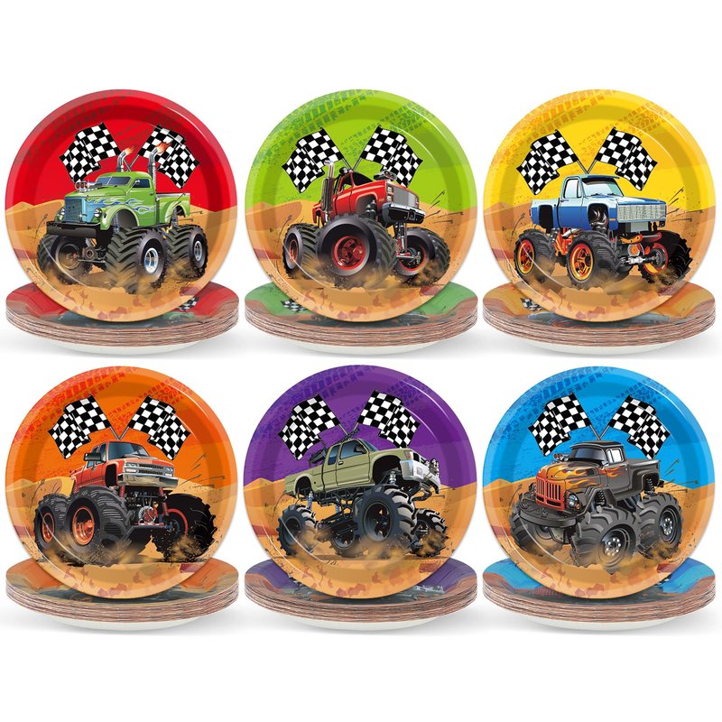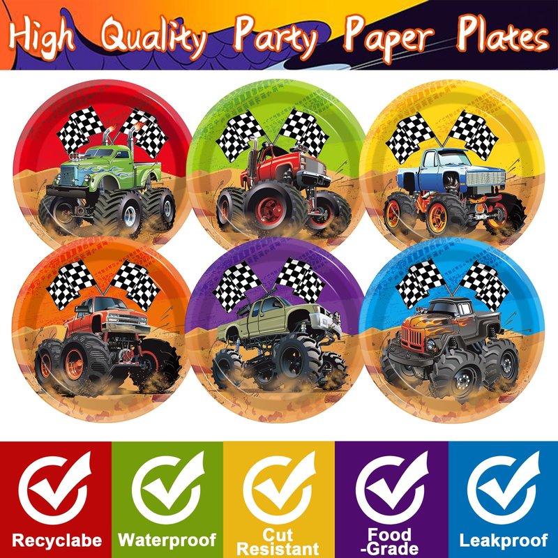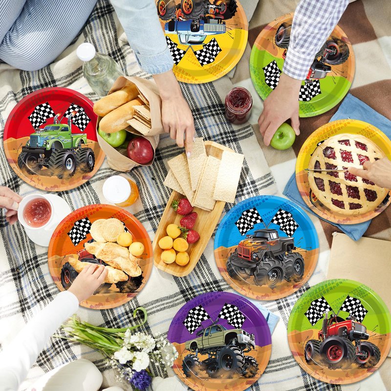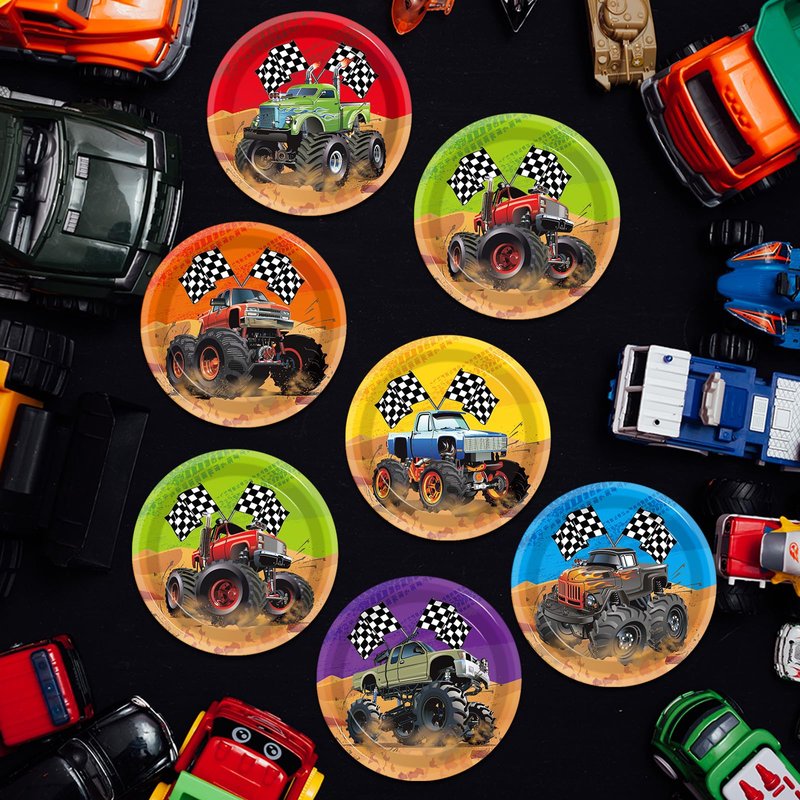 - 2.Monster Truck Birthday Party Decorations: Our Truck Birthday Party Paper Plates feature the exciting world of monster trucks, decorated with images of powerful monster trucks, rugged tires and brightly colored chassis. Eye-catching design adds a splash of color to your event.