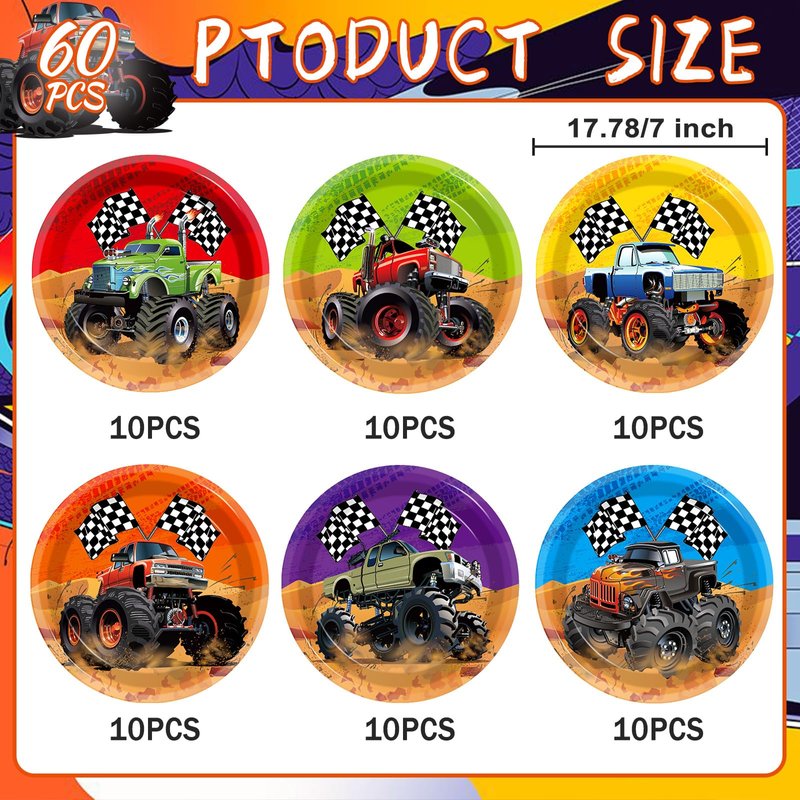 - 1.Package Includes:You will receive 60 pieces of 7-inch Monster Truck Party Plates in 6 different colors and patterns, the classic elements and bright colors will create a truck-themed atmosphere for your birthday party.