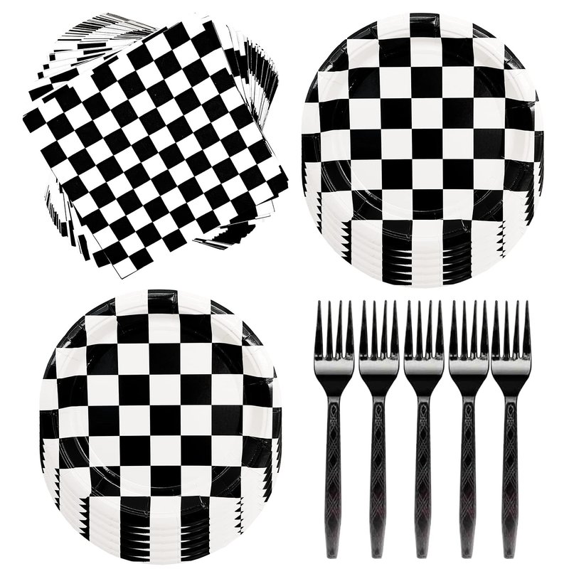 - 【Black and White Checkered Race Car Party Supplies】:7"Black and White Checkered Dessert plates X 20pcs,6.5"Checkered Flag Napkin 20 pcs,6.2"Fork 20 pcs,60pieces in total,suitable for 20guest.