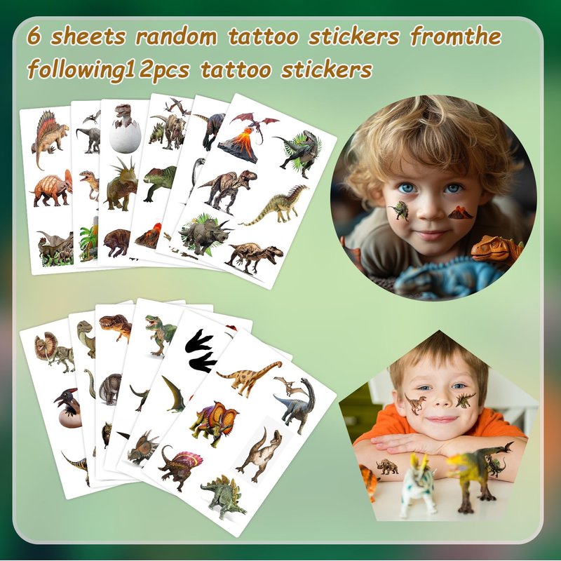 - Package Includes: This is a great set of dinosaur party favors, huge variety of different dinosaurs and other prehistoric themed art; You can get 36 pcs dinosaur tattoo stickers in 36 various styles, 24 pcs realistic dinosaur patterns dinosaur slap bracelet