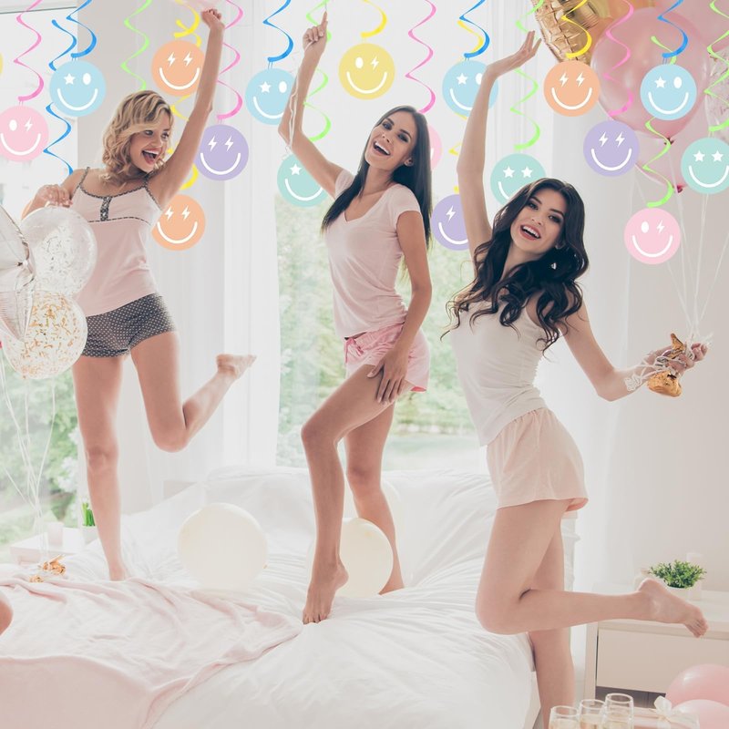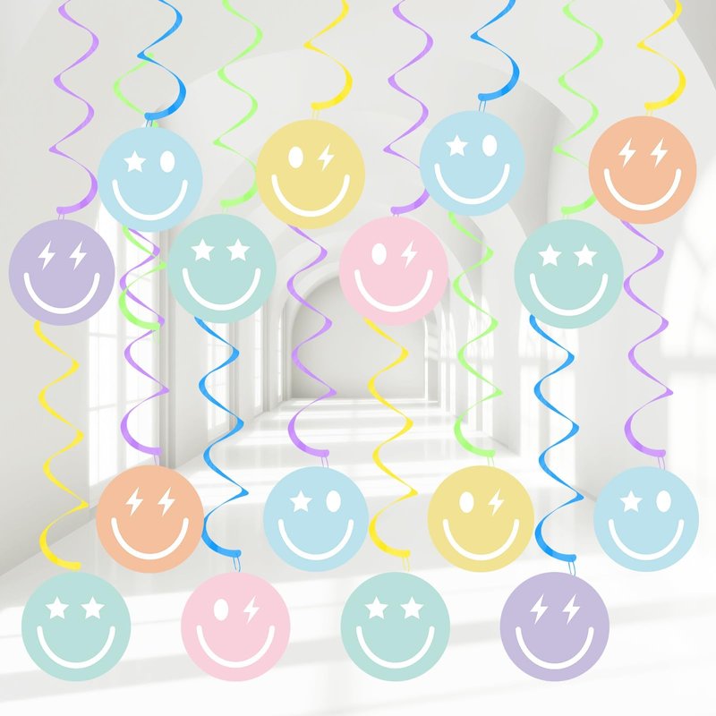 - Perfect size: the smile streamers hanging swirl card party ceiling sign Hanging smiley face preppy birthday decorations boasts a size of approximately 4.7*4.7 inches (12*12cm), crafted from premium-quality cardstock that is both waterproof and wrinkle-resistant. Each foil swirl extends up to an impressive length of 24-28 inches, made from durable PVC material that shines brilliantly without losing its shape or breaking easily