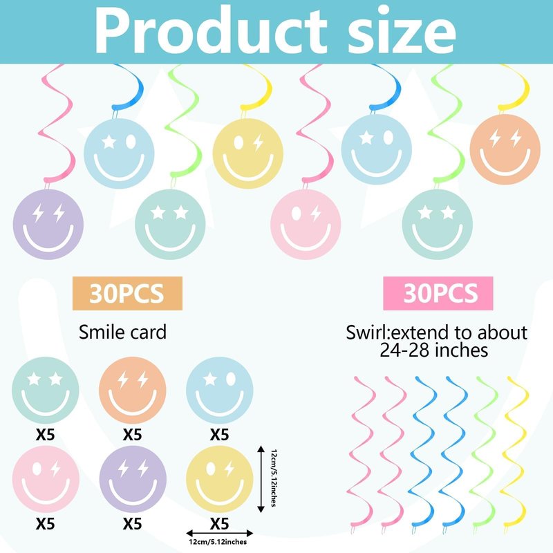 - Package includes: You will get 30 smiling hanging swirl card smiley face party decorations in 6 different patterns, and six different color smiley face swirl preppy party decorations. This sum is sufficient to embellish your celebration and infuse it with a lively and jubilant ambiance