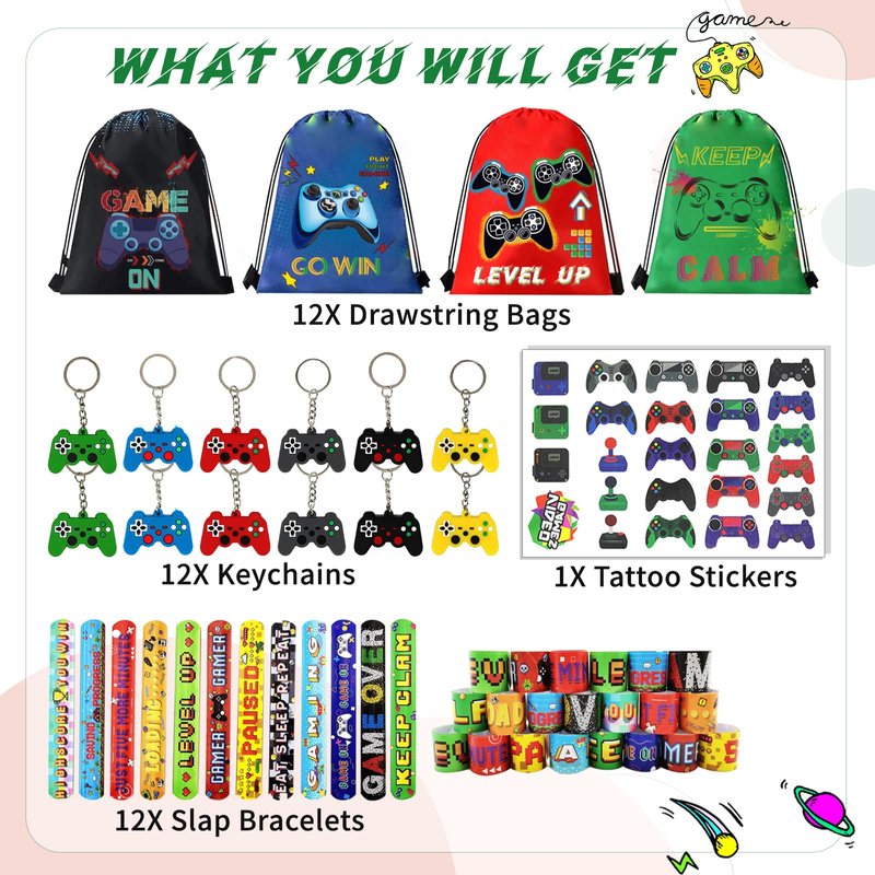 - Super Value Video Game Party Favors: Gamer birthday party favors include 12pcs super capacity video game party drawstring bags, 12pcs slap bracelets, 12pcs key chains and 1pcs tattoo sticker with 25pcs patterns. The gaming party favors can not only meet your party needs, but also be used in daily life, which adds fun to the party and brings convenience to life!