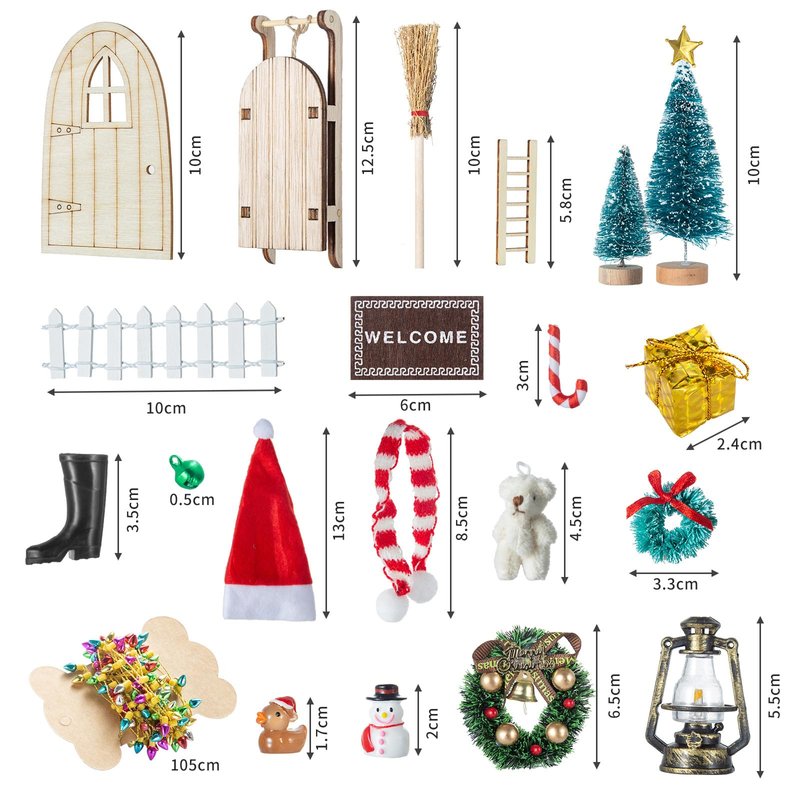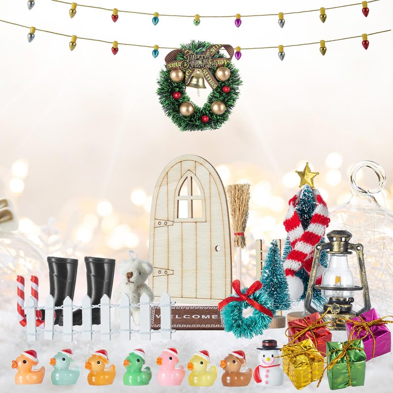 - PACKAGE INCLUDED - 5m string of lights,1 x Christmas hat, 1 x Ladder, 1 x Carpet, 1 x Broom, 1 x Barn lantern, 1 Pair of boots, 1 x tree Decorative star, 1 x sled, 1 x door, 1 x scarf, 1 x snowman, 1 x bear, 1 x Merry Christmas decoration, 2 x guardrails, 2 x Wreath, 2 x Tree, 2 x Candy canes, 7 x Christmas ducks ,12 x Gift boxes, 20 x bells. Let every corner radiate with the joy of Christmas!