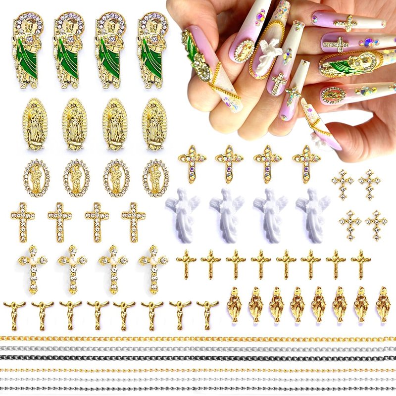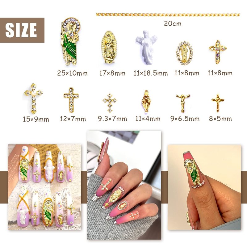 - 【Rhinestones Cross Nail Charms】 The latest luxury rhinestones cross, San Judas, Virgin Mary, Angel relief design. If you are a nail art lover, you must not miss this shiny religious nail charm set. Multi assorted shapes gold nail charms and 6pcs nail chains, make your nails more personality, which is very suitable nail art designer.