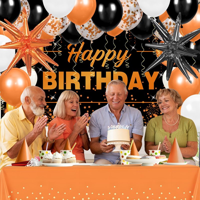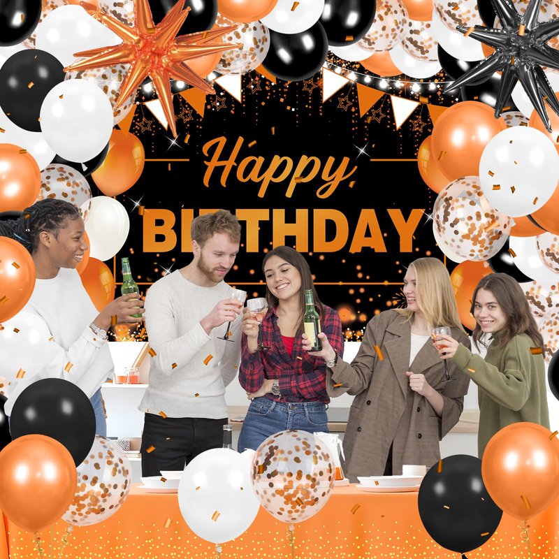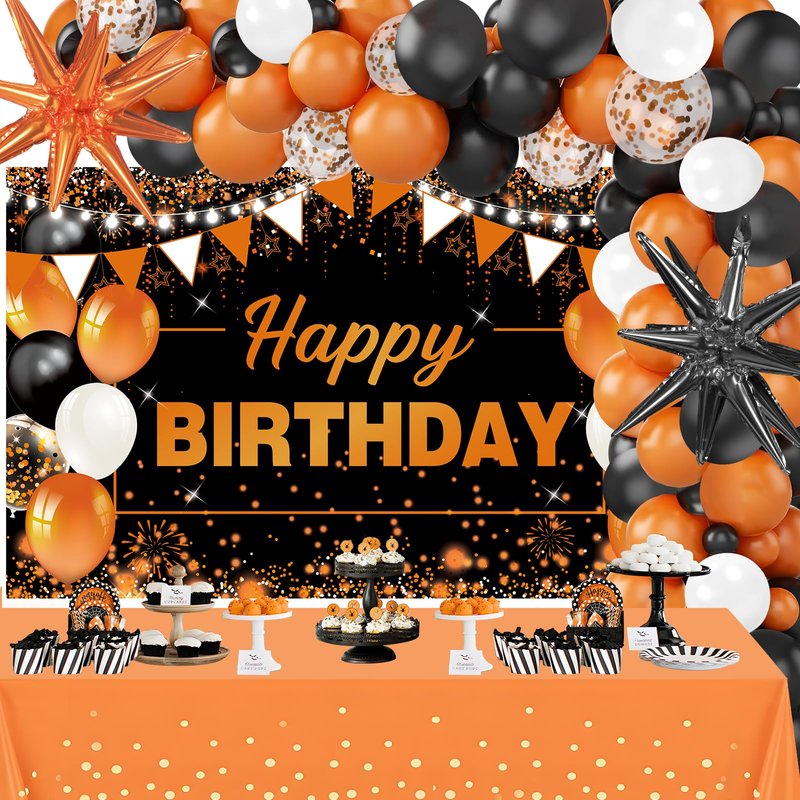- Wonderful Black Orange Birthday Decorations: The package comes with 1 pc black orange happy birthday banner, 1 pc orange tablecloth, 2pcs orange star foil balloons, 55 pcs white black orange latex balloons, 1 pc balloon arch strip, 1 pc ribbon, and 4 pcs stickers. Lots of accessories for you to make a beautidul black orange birthday backdrop.