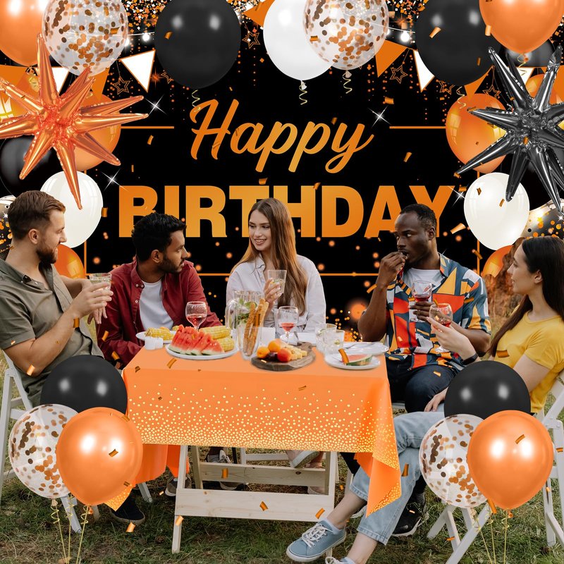 - Material: Orange black happy birthday banner is made of polyester, washable, and reusable. The orange tablecloth is made of waterproof plastic. The black orange balloons are made of latex. You can inflate these latex balloons with air or helium, you can also blow them all up and spread them all around the room and on the tables.