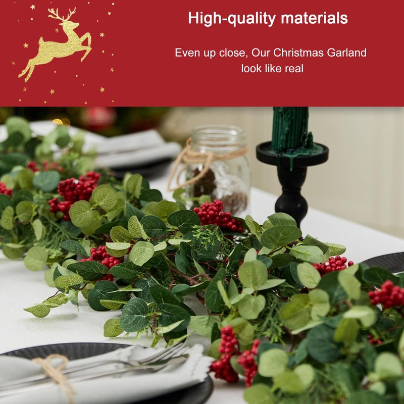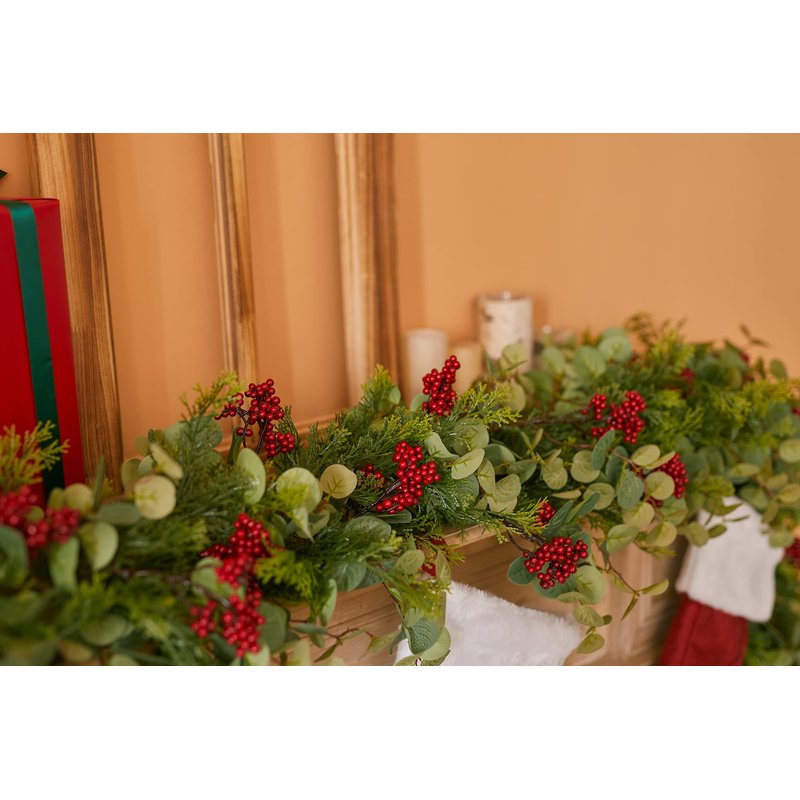 - 【Unique Design】The Christmas garland is mainly composed of pine and cypress, eucalyptus leaves, and red berries, which is very suitable for the Christmas decorations indoor, the length of the garland is 6.3 feet long (without LED lights).