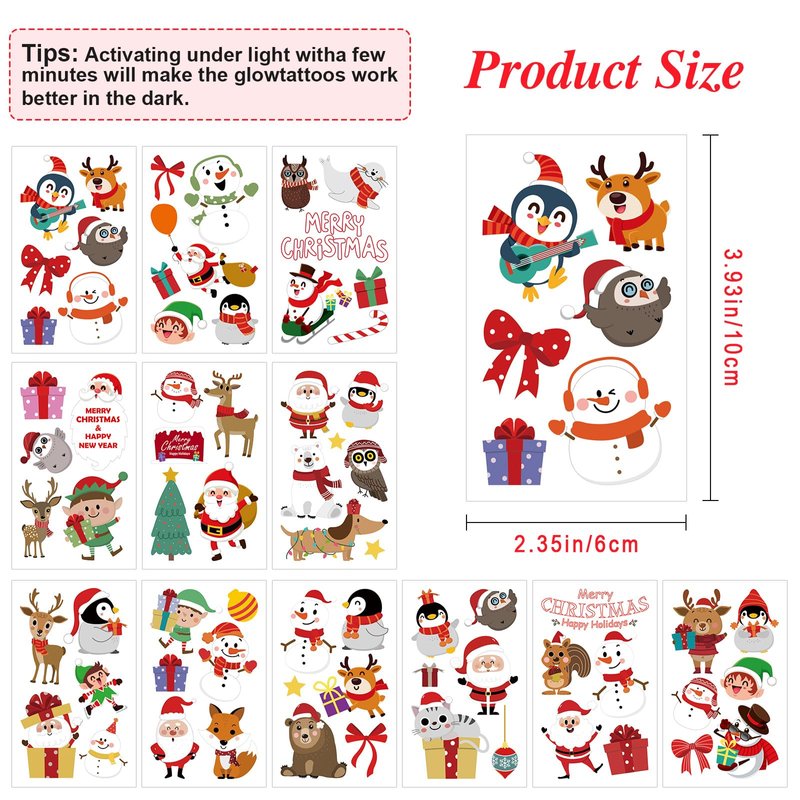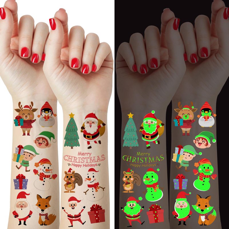 - Christmas tattoos for Kids: 12 sheets 65 pieces Luminous Merry Christmas Theme Temporary Tattoos for Kids, interesting and attractive design, Santa Claus, Christmas tree, reindeer, snowman, gifts and other patterns are attractive for kids, real fun to children's childhood, exquisite packaging, wonderful gifts for kids.