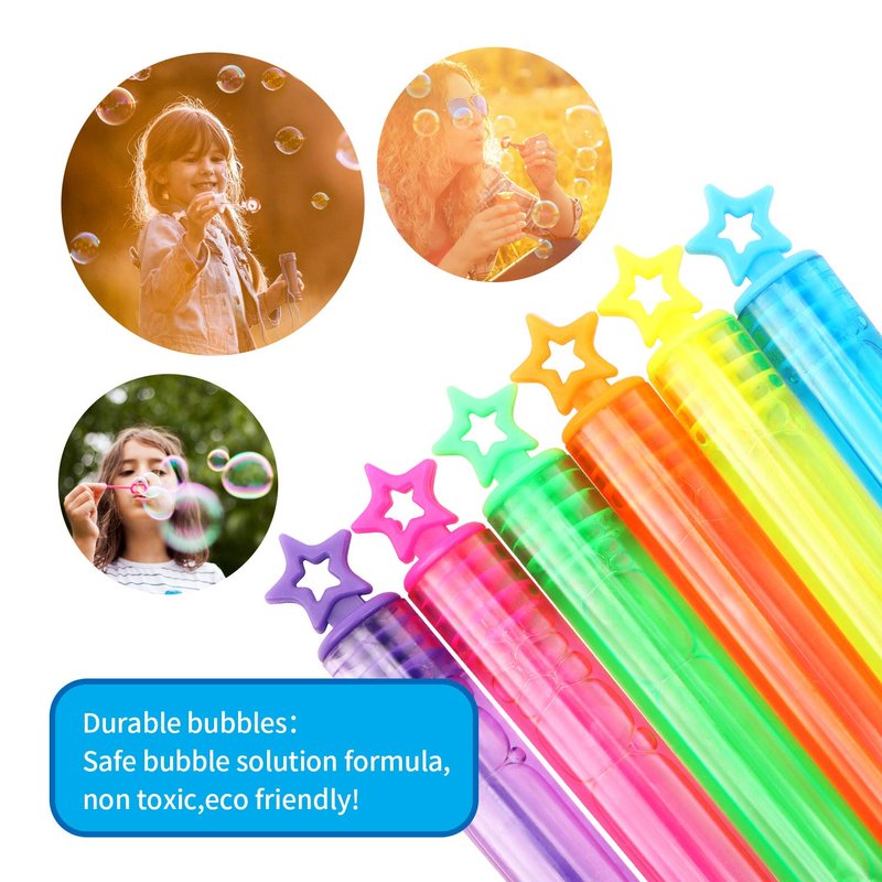 - Worth every penny: This Super Value pack included 66 pcs Bubble Soap Liquid wands, with a cute star design and 6 bright vibrant colors-Pink, Orange, Yellow, Green, Blue, Purple. Sturdy colorful box packaging will make sure every product is delivered in good condition,won't have any leak problems.